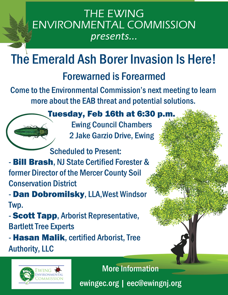 We look forward to welcoming you to this informational meeting about the EAB threat to Ewing Township.
