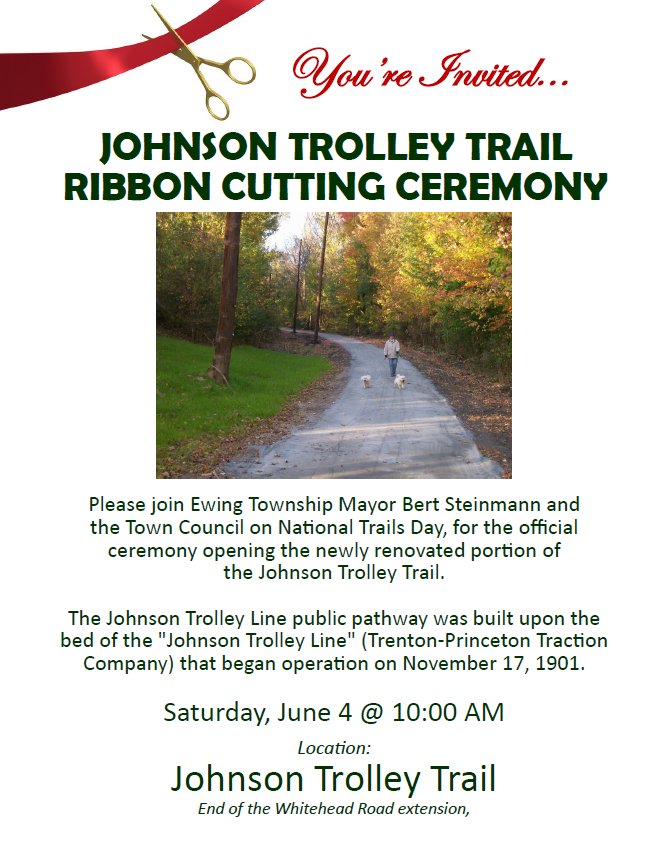 Celebrate National Trails Day on Saturday, June 4th with the dedication of the newly refurbished Johnson Trolley Trail (at the end of Whitehead Road Extension).  Join Mayor Bert Steinman and the Township Council at 10 a.m. at the ceremony opening the newly renovated Ewing portion of the Johnson Trolley Trail and then try it out…