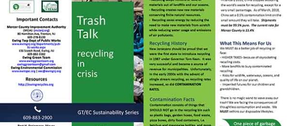 Ewing’s Green Team and Environmental Commission have joined together to publish a new addition to our Sustainability Series of publications, the attached recycling flyer, Trash Talk: Recycling in Crisis, for easy reference to answer your recycling questions.