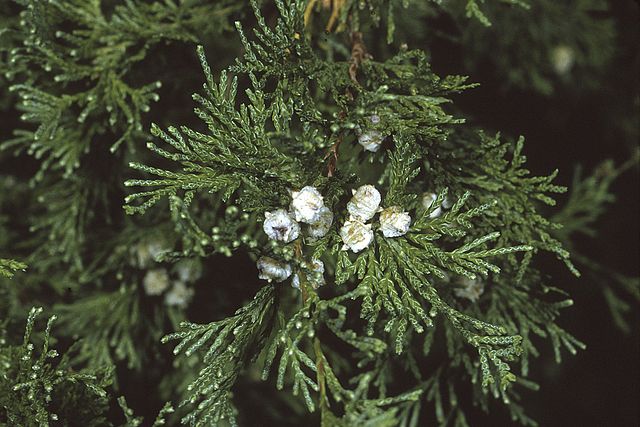 These trees may be confused with Arborvitaes, but they do not share the same type habitat and the foliage and habit are quite different. False Cypress has scaly leaves in a flat, fern-like appearance, which are pointed at the tip. The paired leaves are bluish-green with white margins. The young tree shape is more columnar than Arborvitae. Like Arborvitaes, they are foraged by deer.