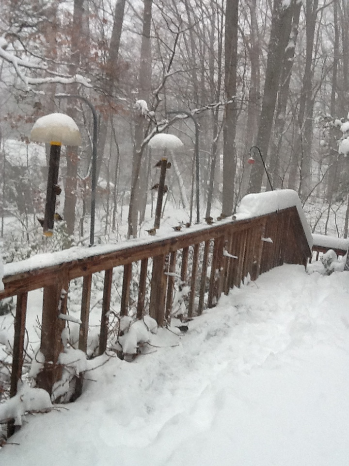 Over the years Ann has landscaped our backyards with trees and shrubs attractive to birds, and we’ve put feeders close to them. A large Blue Holly shrub is between the safflower feeder (columnar in a squirrel-proof cage), and the sunflower hear feeder (two-sided, counter-weighted access bars, suspended from a cable, and beneath a Plexiglas witch’s hat… challenging for squirrels). The Holly gives great cover when hawks are around, as do the Canadian Hemlocks, close by. Winterberry Hollies offer food for seldom seen Bluebirds, among others. Suet (berry and nut, two cakes at a time) are suspended from a cable with a large platter above them to discourage squirrels (it does), but in high winds, like now, the platter becomes a sail and the whole contraption ends up five or ten yards away; it’s exciting to see it fly off. Finally, the two thistle feeders are on curved poles off the deck rail, one of them is a large pan of water, year-round. It’s got a thermostat in it now to keep the water from freezing, and it always draws a crowd.